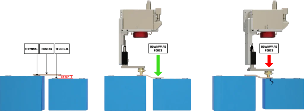 Proper joint fit-up is essential for stable laser welding. Misalignment between tabs, busbars